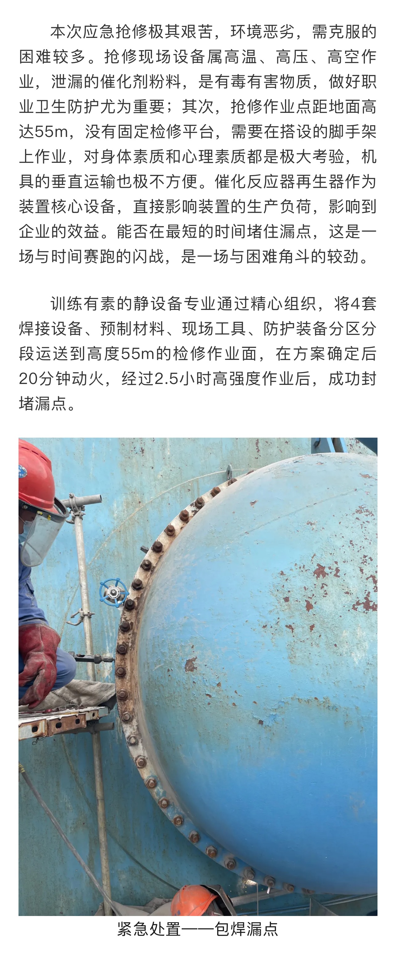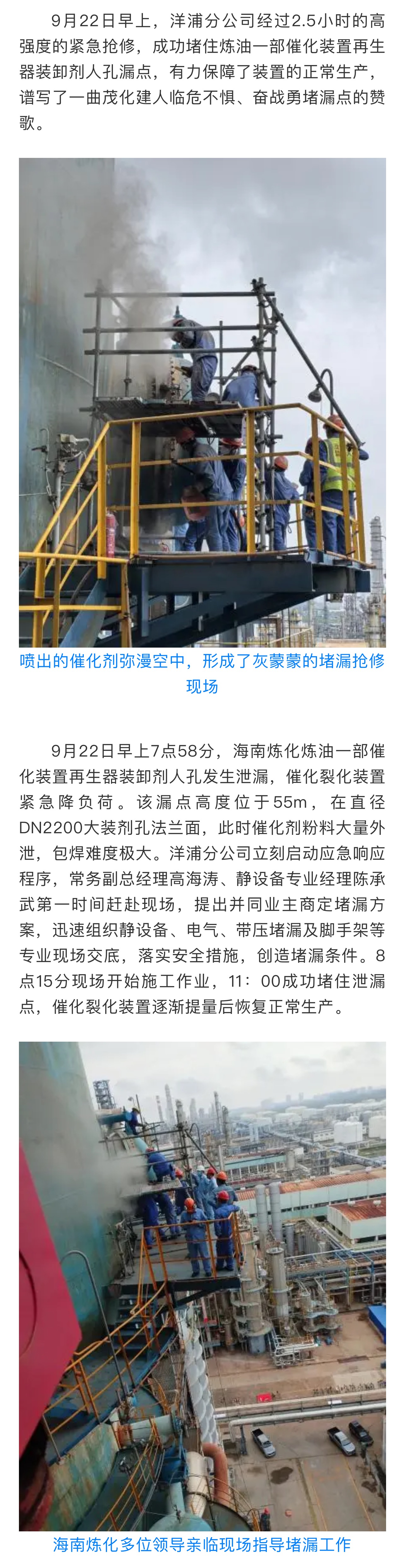 洋浦分公司高強(qiáng)度作業(yè)2.5小時,成功堵住再生器漏點