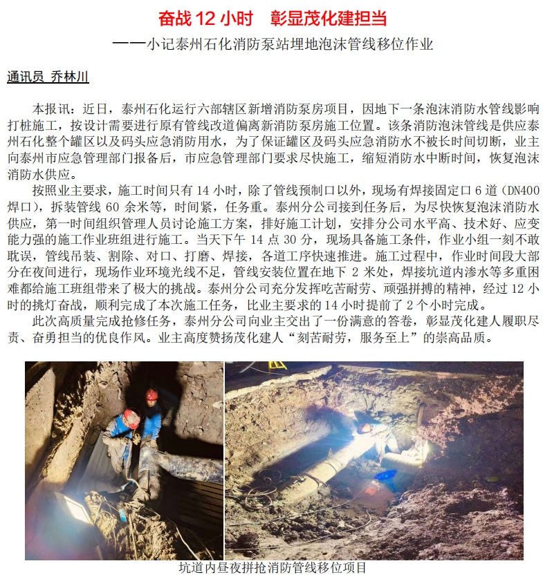 記泰州石化消防泵站埋地泡沫管線移位作業(yè)
