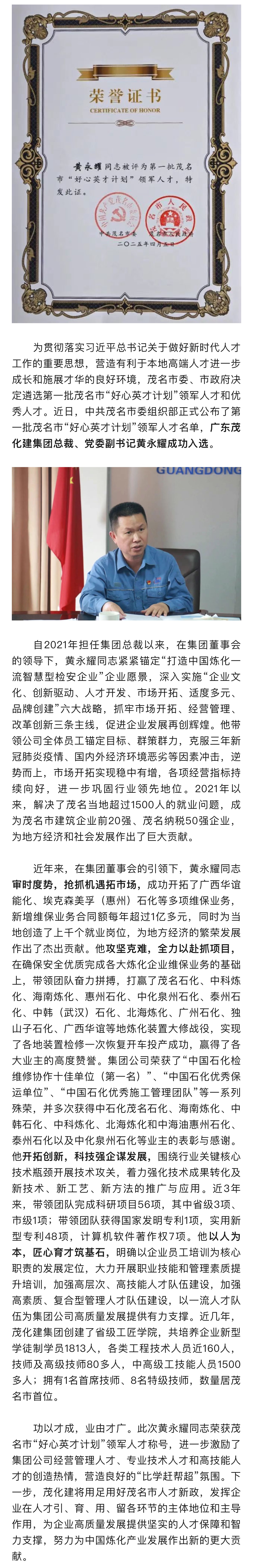 祝賀!廣東茂化建集團(tuán)黃永耀同志被評為第一批茂名市“好心英才計劃”領(lǐng)軍人才