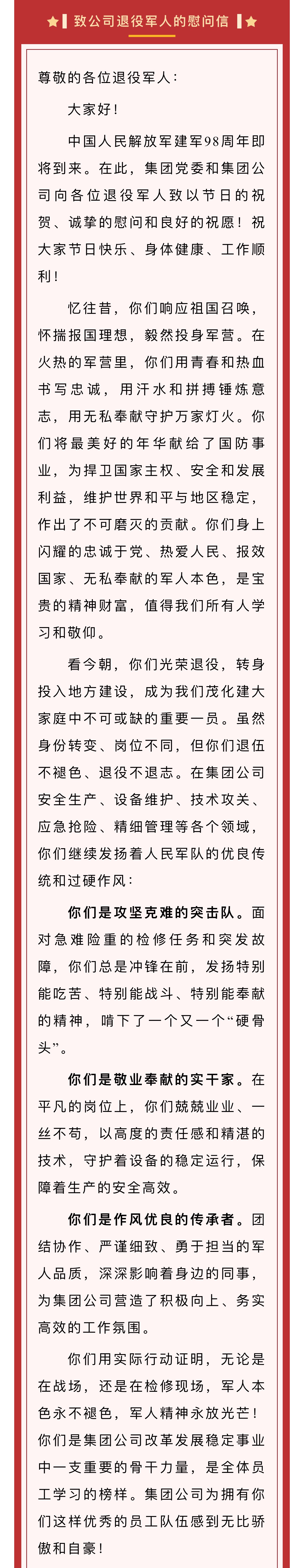 八一建軍節(jié) | 致公司退役軍人的慰問(wèn)信