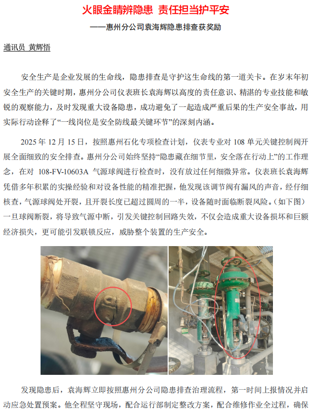 惠州分公司袁海輝隱患排查獲獎勵